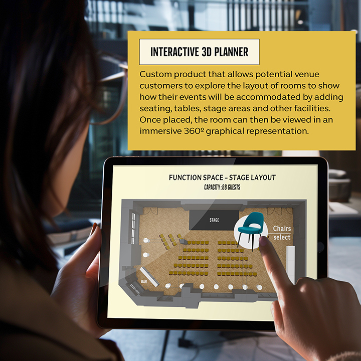 Our interactive 3D planner empowers venues to elevate guest experience and operational efficiency by allowing users to visualise and customise spaces in real time. Whether planning events, weddings, or conferences, clients can explore different room layouts, seating arrangements, and décor options virtually, enhancing collaboration and decision-making without the need for multiple site visits. Saves on time and resources and boosts booking confidence by providing a clear, dynamic understanding of how the space will look and feel.